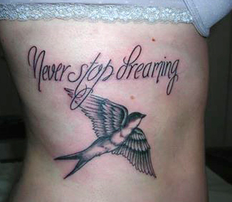 Tatouage hirondelle et écriture calligraphie style réaliste et old school