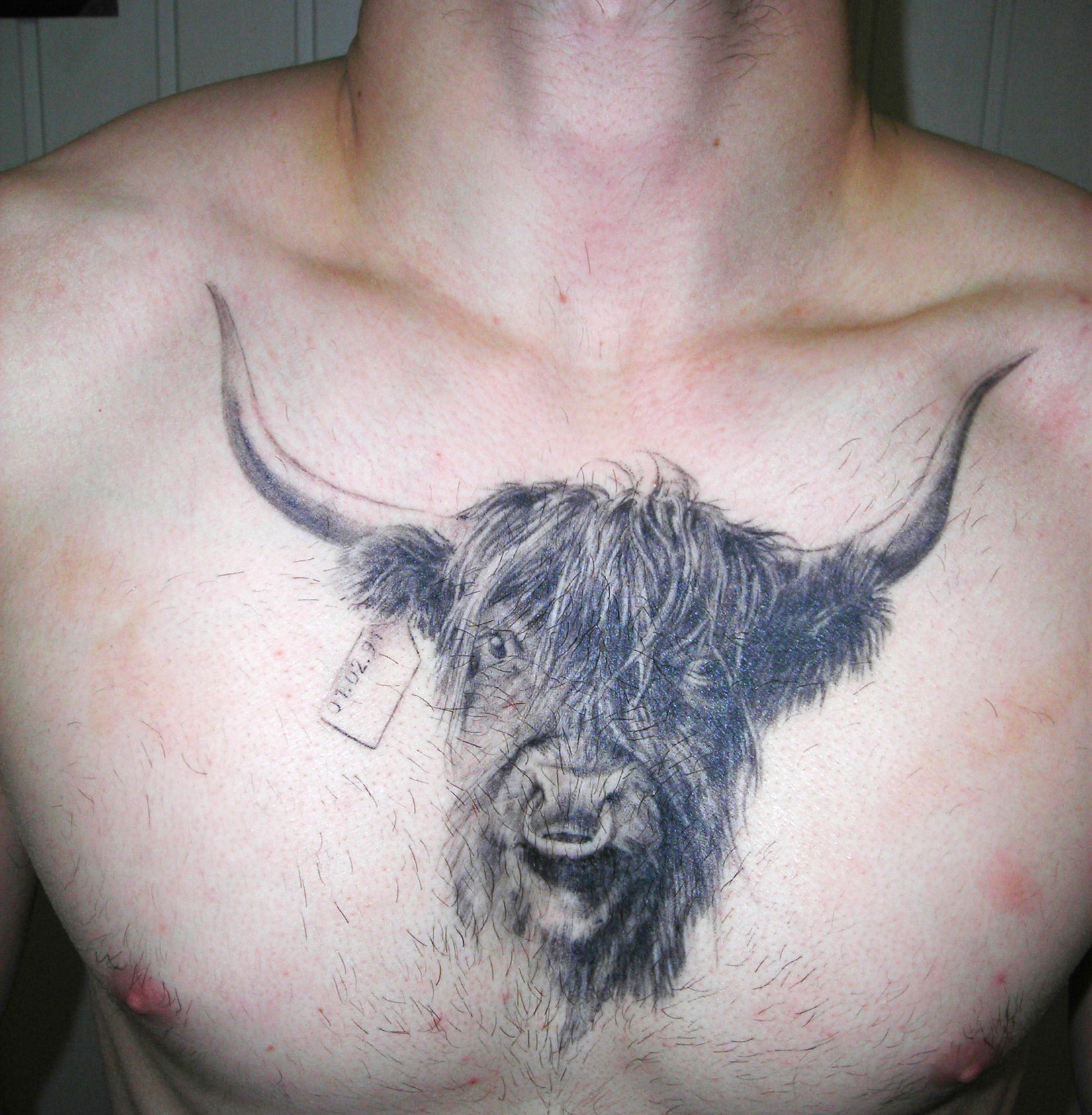 Tatouage de vache sur le torse en noir et ombre.